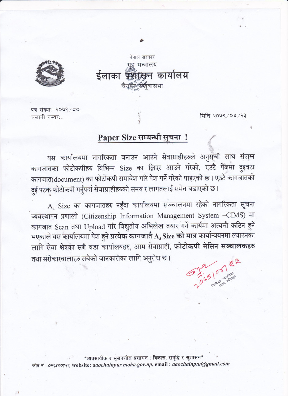 नागरिकताको अभिलेख तथा सोधपुछका लागि तलको सम्पर्क नं र इमेलमा सम्पर्क गर्नुहोला ।